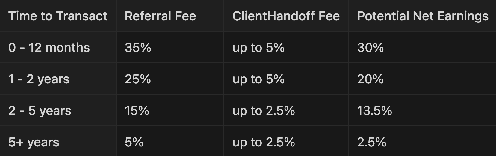 *The referral fee model above is an example of our "traditional" succession plan. We understand that each of our agent partners are at different places in their career and have unique needs.